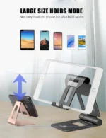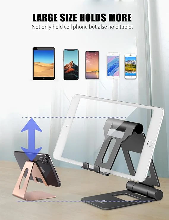 • The foldable cell phone desk stand is stronger and dual multi-angle adjustable. It can fit your phone with thicker cases and be adjusted to your desired angle. Compared with other phone stands, the hook of our cell phone desk stands has been widened to fit well with the devices in protective cases.