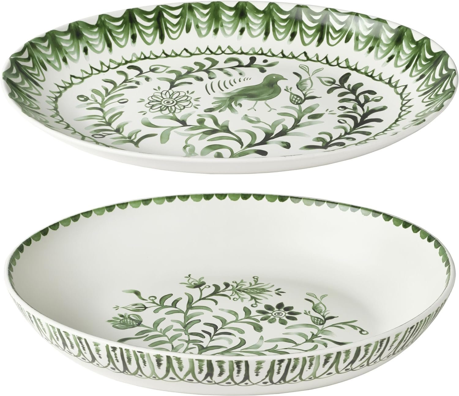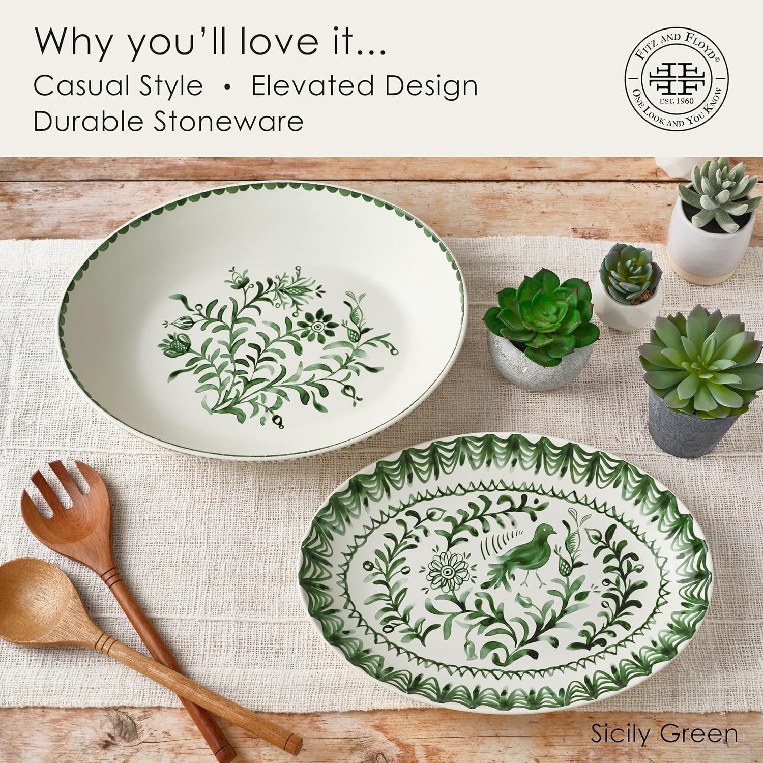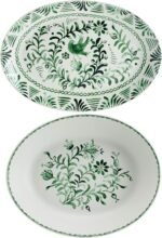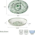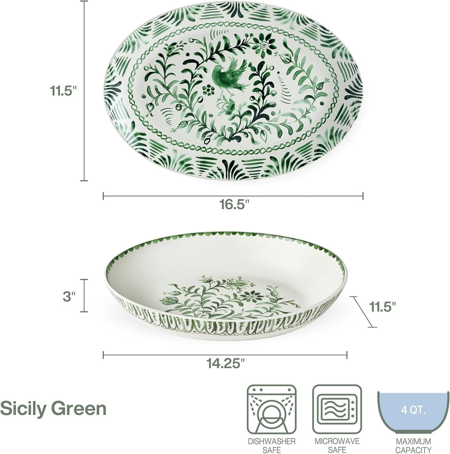 Bring a lively look to your tabletop when you serve sides with this Sicily Green Oval Serving Bowl and Serving Platter by Fitz and Floyd. Both are crafted of durable stoneware for strength and durability, this charming set is adorned with vibrant green floral designs and both are generously sized to hold a variety of main meals. sides, salads, or pasta. Set includes one 4 quart oval serve bowl measuring 14-1/4 inch long by 11-1/2 inches wide by 3-inches high and one serving platter measuring 16-1/2 inches long by 11-1/2 inches width by 1-1/2 inches high. Dishwasher and microwave safe.