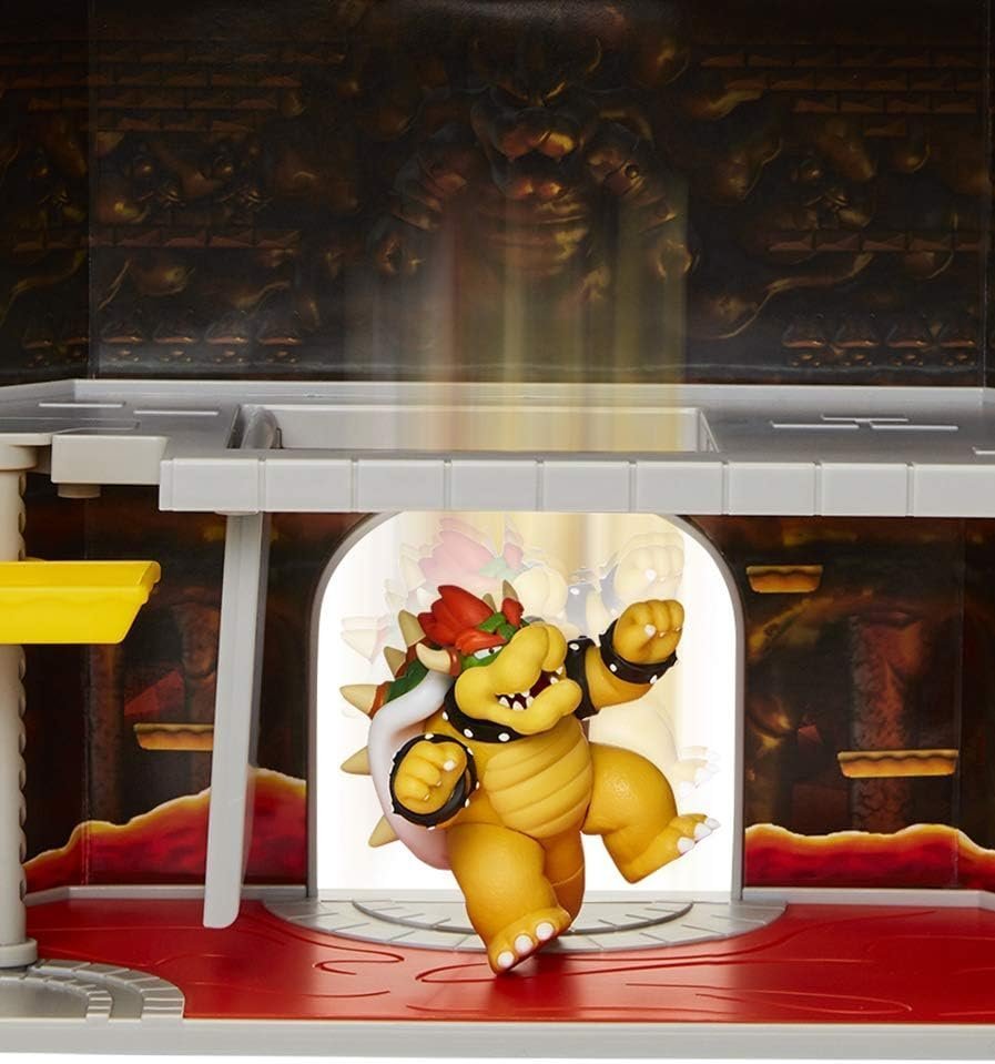 - Drop Bowser into the lava by triggering the trap door, or press down on the castle’s spire to trigger authentic in game sounds and music.