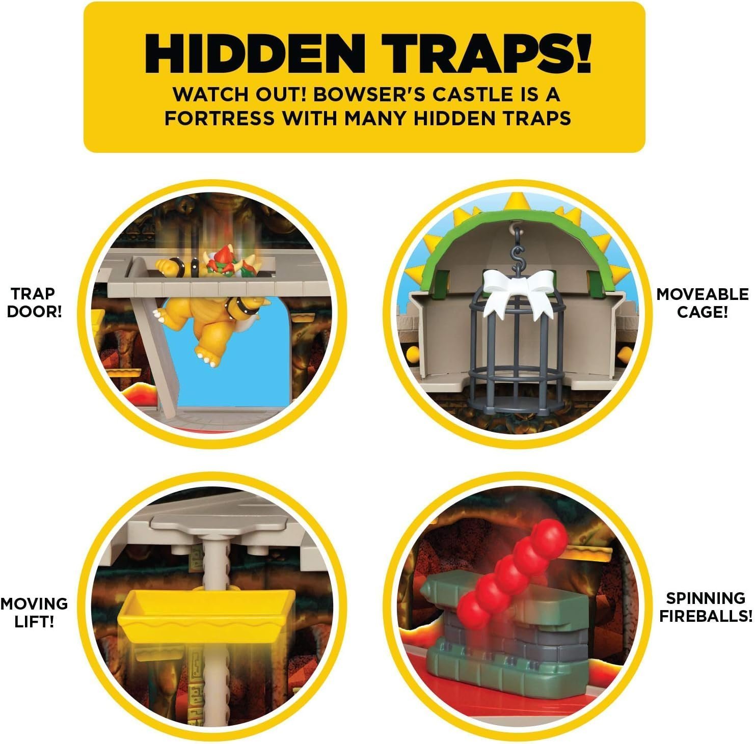 - Explore Bowser’s interactive castle but beware of the hidden traps including spinning fireballs, opening cage, moving lift and trap door